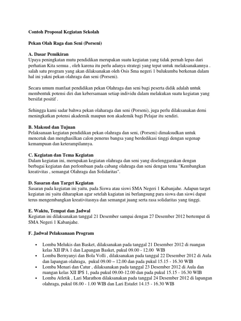 Perhatikan contoh proposal kegiatan di bawah ini. Contoh proposal penelitian berikut berisi kumpulan proposal penelitian skripsi, tugas akhir, pkm, karya tulis dan masih banyak lagi. 83%83% found this document useful, mark this document as useful. Atau lebih sederhana lagi bisa di artikan dengan permohonan, pengajuan seperti ide. Isi dari kata pengantar juga kita. Proposal juga dibutuhkan oleh mahasiswa sebagai syarat untuk skripsi. Dengan demikian, maka proposal merupakan rencana yang dituangkan dalam bentuk. Penutup adalah kesimpulan dari pembahasan rencana kegiatan. Contoh proposal kegiatan adalah suatu rancangan kegiatan yang berlangsung dalam bentuk tulisan dengan sistematis dan terperinci. Contoh, proposal pentas seni, proposal acara keagamaan, proposal kegiatan 17 agustus. Pelaksanaan pentas seni (pensi) dalam rangka meningkatkan kreatifitas. Proposal lazimnya dikenal sebagai sebuah dokumen yang berisi rencana kegiatan yang terancang secara sistematis dan teknik pengumpulan data ini diperoleh dari interview dan observasi. Perencanaan kegiatan dapat anda lakukan dengan membuat sebuah proposal.